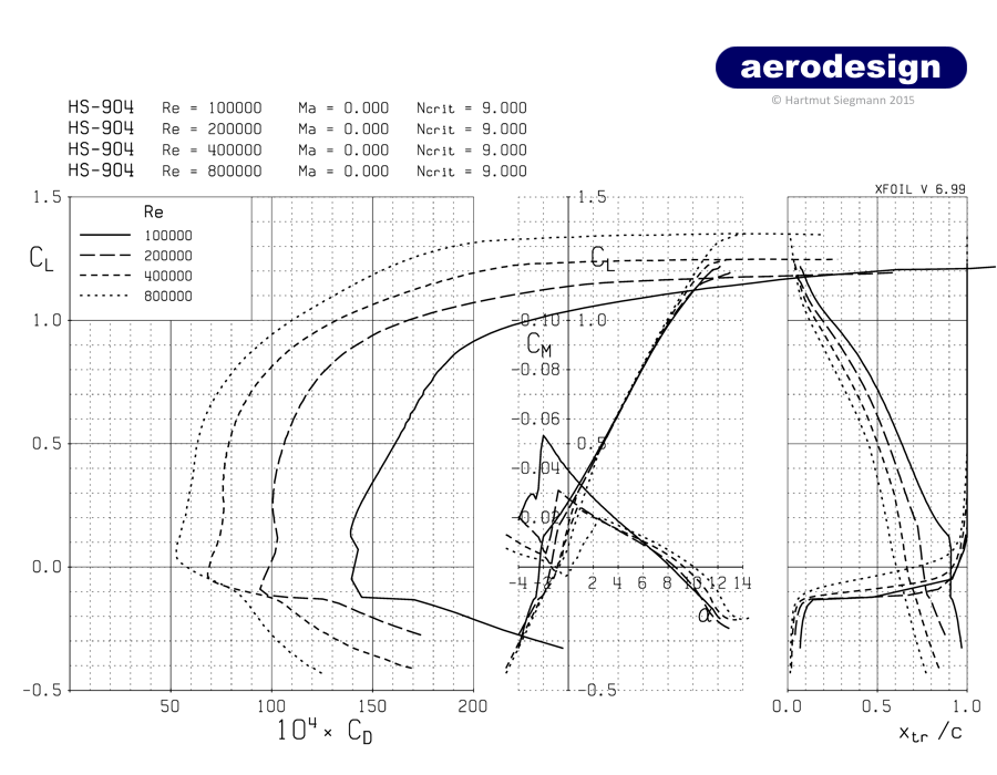 Bitte beachten, dass dieses Profil nicht für große gepfeilte Schwanzlose mit Winglets gedacht ist, in dem Anwendungsfall wäre der Nickmomentenbeiwert des Wurzelprofils zu positiv. In dem Einsatzbereich würde man eher ein Profil mit längeren laminaren Laufstrecken einsetzen. Das ist bei einem Nurflügel aufgrund der Flugeigenschaften nicht sinnvoll, insofern ist das HS-904 ein reinrassiges Profil für Nurflügel. Das Profil wurde inzwischen erprobt und hat sich als harmonisch zu fliegendes Profil bewährt.
